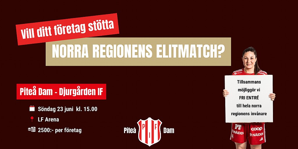 Den 23 juni bjuder vi in hela norra Sverige till en härlig publikmatch, med fri entré, där vi tillsammans med partners vill ge hela norra regionens invånare möjlighet att se fotboll på absolut högsta nivå. Genom att erbjuda alla gratis inträde och större spridning hoppas vi kunna locka en jättepublik till Piteå då det enda elitlaget norr om Solna spelar match.